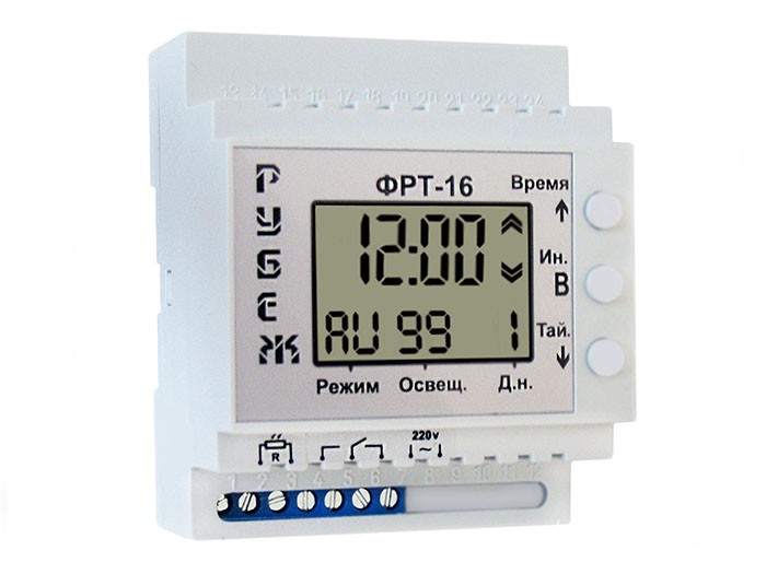 Фотореле ФРТ-16 надалі прилад, призначений для керування системами освітлення. Прилад вимірює освітленість за допомогою виносного датчика високої чутливості (фоторезистор), і здійснює включення або відключення освітлювальних приладів, також включення або відключення може здійснюватися за встановленим часом, останнє пріоритетне. Також споживач може керувати станом контактів реле приладу у ручному режимі (ON/AU/OF).